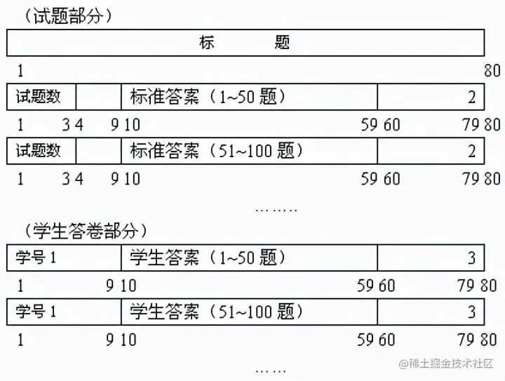 现有一个学生标准化考试批阅试卷,产生成绩报告的程序。其规格说明如下:程序的输入文件由一些有80个字符的记录组成,如右图所示,所有记录分为3组:
