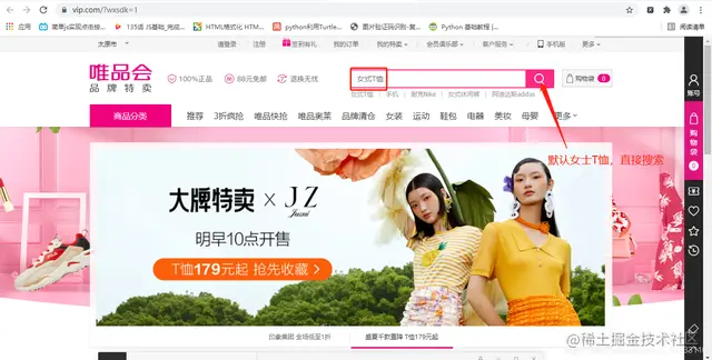 1.进入百度搜索唯品会,进入唯品会的官网,默认女士T恤,直接点击搜索进入如下