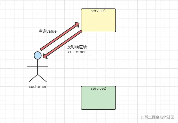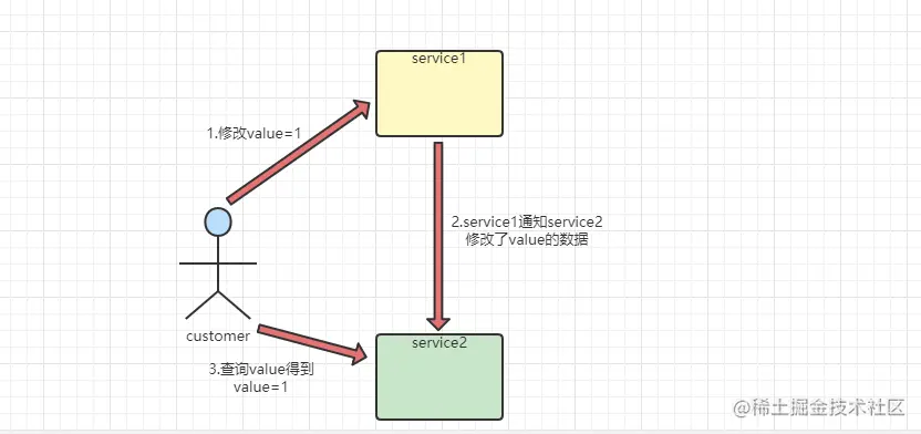 因此基于这种情况,在customer发起修改service1的值为1时,service1需要向service2发起一条通知消息,告诉service1,我的值已经被修改为了1,那么即使customer向service2发起查询请求时查询到的值依然是1,这样就保证了在分布式系统中的一致性。