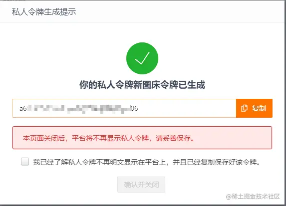 这里一定先将令牌复制,暂时保存下来,在后面配置PicGo要用到,并且这个页面关闭后便不会再有地方展示了。