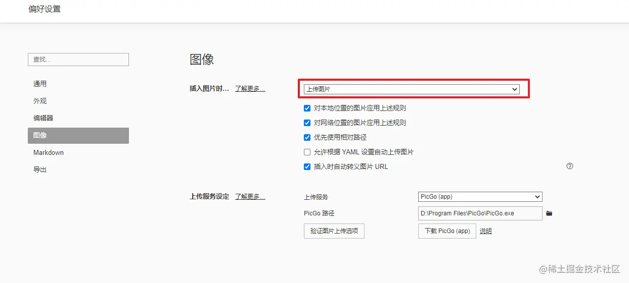 打开Typora的"文件"->"偏好设置",按我下图中的完成勾选,插入图片时选择上传图片,上传服务选择PicGo,选择本地安装PicGo的路径。完成后重启Typora。