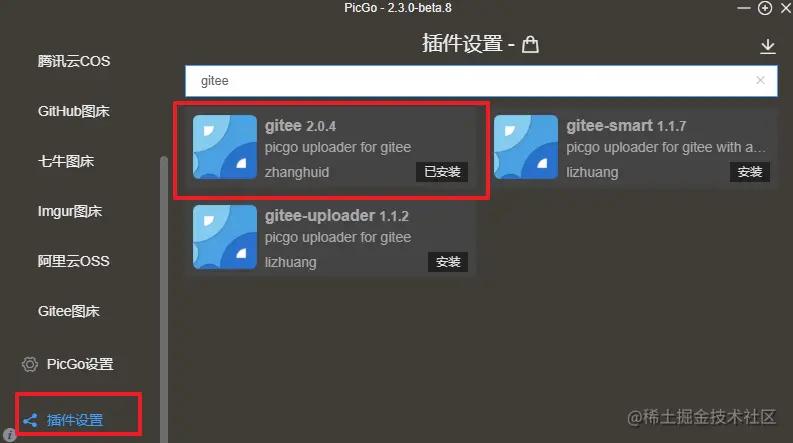 新安装的PicGo的图床设置中是没有Gitee图床的,需要按安装插件(谁让咱穷呢/(ㄒoㄒ)/~~)当然安装很简单。