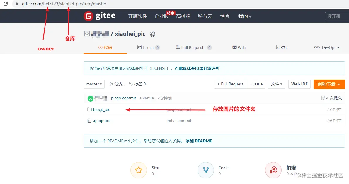 注意一定要选择“开源”,这样别的平台才能访问到你的图片,勾选初始化仓库,选择分支模型为“单分支模型”,这样会默认创建出Master分支。