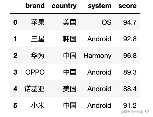 df = pd.DataFrame({'brand': ['苹果', '三星', '华为', 'OPPO', '诺基亚', '小米'],