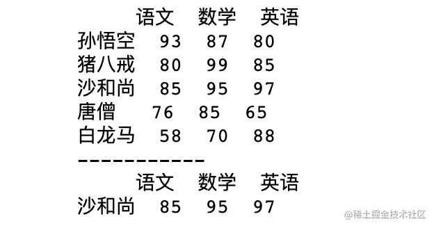 唐僧师徒加上白龙马一行五人去参加成人考试,考试科目包含语文、数学、英语共三门,现在想要知道三门科目成绩均不小于85分的人有哪些?