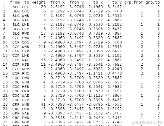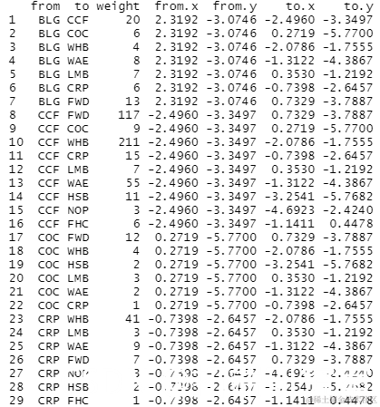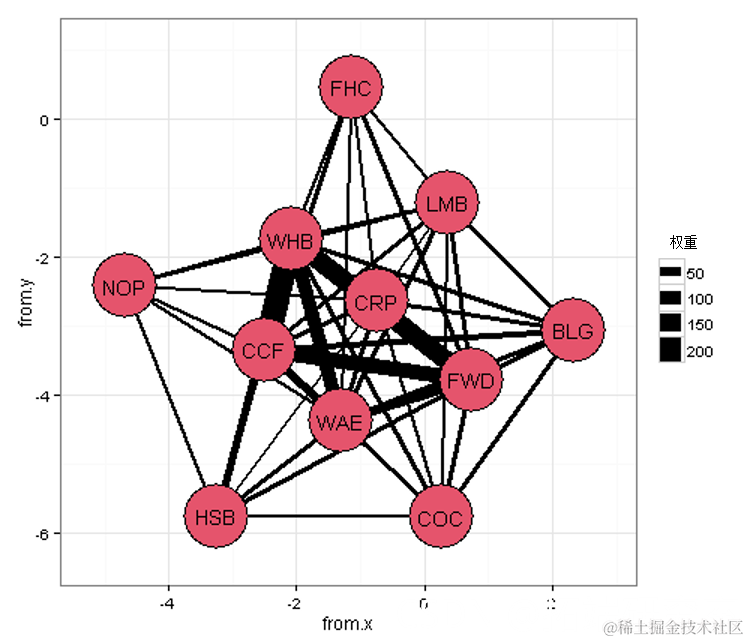 首先让我们提取数据,产生左边的网络基本图。GGPLOT需要数据为数据框,所以提取数据并将其转换为数据框