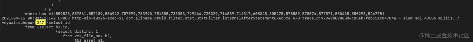 在茫茫日志中,有一个熟悉的数字 t247, 而且不止出现一次。这个SQL执行了49s。