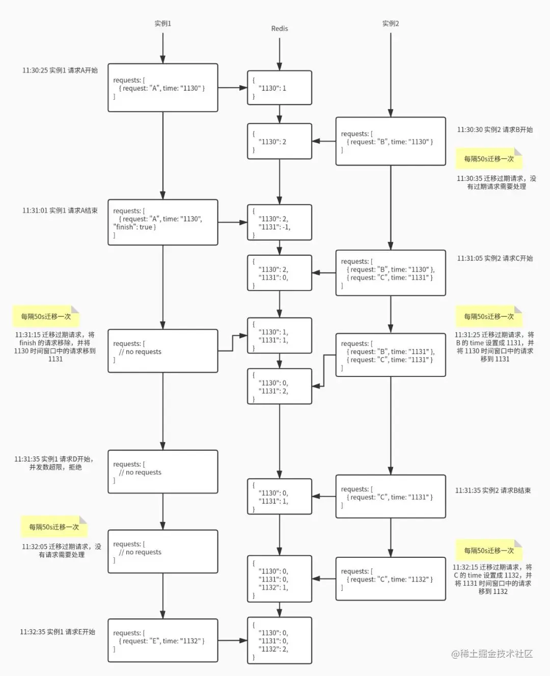 第二种方法我称之为 双窗口滑动算法,结合了 TTL 计数器和滑动窗口算法。我们按分钟来设置一个时间窗口,在 Redis 里对应 202009051130 这样的一个 key,value 为计数器,表示请求的数量。当接受一个请求后,在当前的时间窗口中加一,当请求结束,在当前的时间窗口中减一,注意,接受请求和请求结束的时间窗口可能不是同一个。另外,我们还需要一个本地列表来记录当前实例正在处理的所有请求和请求对应的时间窗口,并通过一个小于时间窗口的定时线程(如 30 秒)来迁移过期的请求,所谓过期,指的是请求的时间窗口和当前时间窗口不一致。那么具体如何迁移呢?我们首先需要统计列表中一共有多少请求过期了,然后将列表中的过期请求时间更新为当前时间窗口,并从 Redis 中上一个时间窗口移动相应数量到当前时间窗口,也就是上一个时间窗口减 X,当前时间窗口加 X。由于迁移线程定期执行,所以过期的请求总是会被移动到当前窗口,最终 Redis 中只有当前时间窗口和上个时间窗口这两个时间窗口中有数据,再早一点的窗口时间中的数据会被往后迁移,所以可以给这个 key 设置一个 3 分钟或 5 分钟的 TTL。判断并发量时,由于只有两个 key,只需要使用 MGET 获取两个值相加即可。下面的流程图详细描述了算法的运行过程: