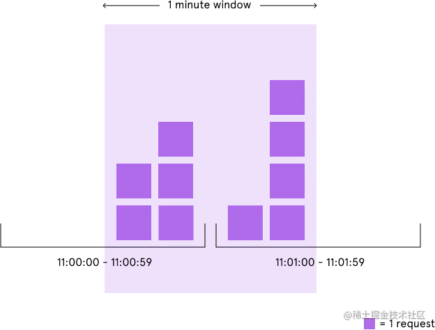 固定窗口算法是一种最简单的限流算法,它根据限流的条件,将请求时间映射到一个时间窗口,再使用计数器累加访问次数。譬如限流条件为每分钟 5 次,那么就按照分钟为单位映射时间窗口,假设一个请求时间为 11:00:45,时间窗口就是 11:00:00 ~ 11:00:59,在这个时间窗口内设定一个计数器,每来一个请求计数器加一,当这个时间窗口的计数器超过 5 时,就触发限流条件。当请求时间落在下一个时间窗口内时(11:01:00 ~ 11:01:59),上一个窗口的计数器失效,当前的计数器清零,重新开始计数。
