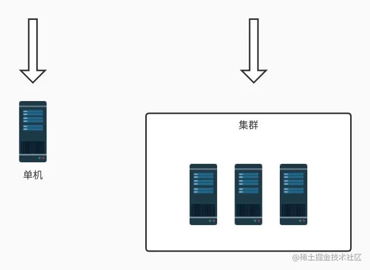 针对不同的系统架构,需要使用不同的限流方案。如下图所示,服务部署的方式一般可以分为单机模式和集群模式: