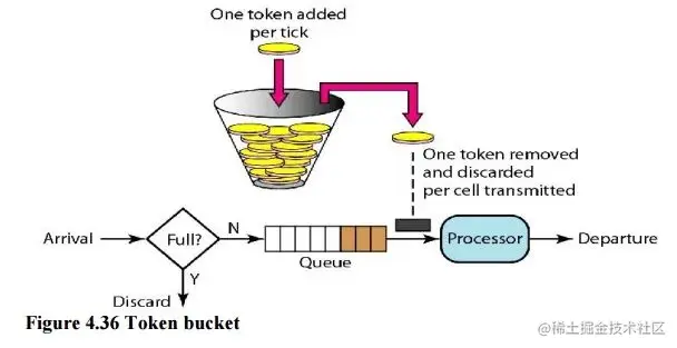 当请求到达时,不直接处理请求,而是将其放入一个队列,然后另一个线程以固定的速率从队列中读取请求并处理,从而达到限流的目的。注意的是这个队列可以有不同的实现方式,比如设置请求的存活时间,或将队列改造成 PriorityQueue,根据请求的优先级排序而不是先进先出。当然队列也有满的时候,如果队列已经满了,那么请求只能被丢弃了。漏桶算法有一个缺陷,在处理突发流量时效率很低,于是人们又想出了下面的令牌桶算法。