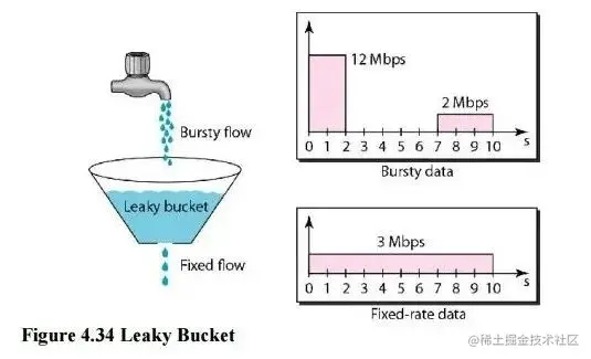桶的上面是个水龙头,我们的请求从水龙头流到桶中,水龙头流出的水速不定,有时快有时慢,这种忽快忽慢的流量叫做 Bursty flow。如果桶中的水满了,多余的水就会溢出去,相当于请求被丢弃。从桶底部漏出的水速是固定不变的,可以看出漏桶算法可以平滑请求的速率。