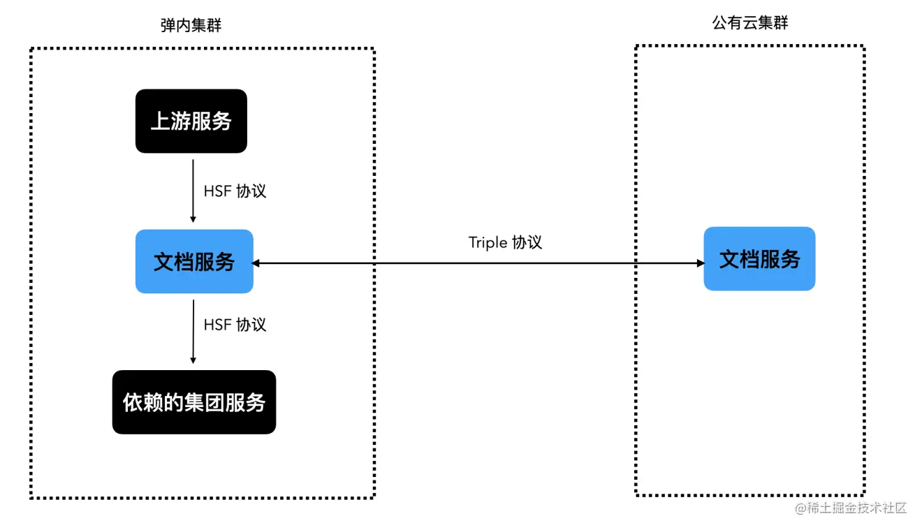 文档目前有两个集群。弹内集群暴露了 triple、hsf 双协议,云上集群仅暴露 triple 协议。