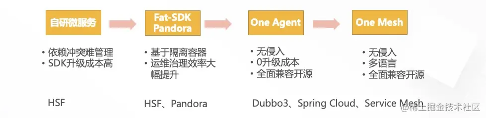 首先,迁移成本上来说,希望把降低迁移成本为 0,最开始我们在云上售卖的是 HSF + EDAS Container 这一套的架构,因此客户在上云的时候,不得不对自己的业务代码进行改造,另外,由于代码不开源,排查问题也是一个非常头疼的问题,后来,我们发现客户大多数的微服务框架都会选择开源的 Dubbo/Spring Cloud,但是客户有自建的注册中心,如果要上云还需要把自己的注册中心迁移到 MSE 注册中心上,这个过程需要用户对代码做改造才行,一般来说会采用双注册的方案,在云上我们发现推动客户做代码改造,包括 SDK 的升级是一件非常难的事情,很多客户的 Dubbo 版本还停留在 4-5 年的版本,不仅需要研发、测试、运维都来关注,还需要排期支持,这个动作会耗费大量的人力资源,同时面临许多稳定性的挑战。光是这一步就会阻挡住许多的客户了,为了解决客户 SDK 升级的问题,我们在想,能不能不要迁移注册中心呢,最好是代码一行也不用改,部署到云上来,但我们又需要提供同等的服务治理能力,因此,我们提出了基于 Java Agent 字节码增强的技术,帮助用户不改一行代码使用云产品,对客户做到了随时可上可下,没有绑定,让客户比较放心的上云产品,同时我们还提供了能力更强的面运维的托管的注册中心。