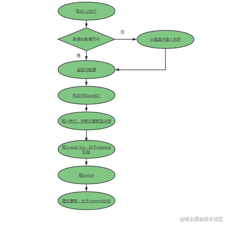 - 执行器拿到存储引擎返回id = 2结果后,给age加上1,原来是25,现在就是26,在调用引擎接口写入这行新数据。