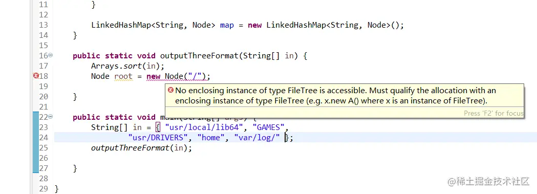 错误的含义是,没有可以访问的外部实例enclosing instance。必须分配一个合适的外部类FileTree的实例(如x.new A(),x必须是FileTree的实例。)