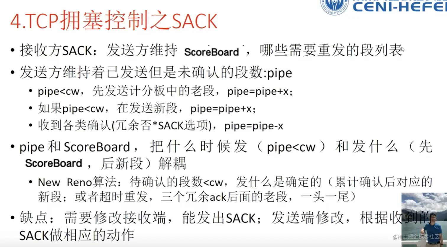 针对New Reno算法在连续段丢失情况下,一个RTT只能恢复一个丢失段效率不高的问题提出改进。 发送方收到SACK知道接收方收到段的情况,通过选项知道接收方缺失的段。将这些段维持在scoreboard中,只要pipe小于cwnd,发送方就可以先发计分板中的丢失段;在发送完毕老的丢失段后,pipe如仍小于cwnd,发送方发送新段,每发送一个段,pipe+1。 发送方收到确认 从pipe当中减去1或者2,将管道中丢失的走出去的段从pipe中减去。 将(pipe小于cwnd)发送条件和发什么解耦。