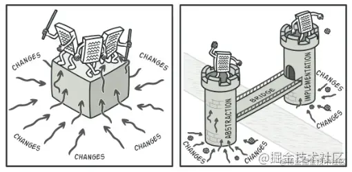 引入桥接模式可以解决这种问题,这里的两个变化维度很清晰:形状 & 颜色,我们把前者理解为 抽象部分,后者理解为 实现部分,在它们之间搭座桥。