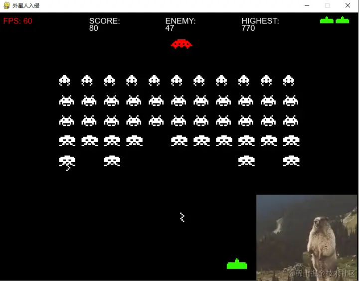 游戏规则:我方控制炮台击落外星人入侵地球🌏,每次可以重生三次,击毁一次外星人相应加分,进入下一关,完成全部关卡即可通关。