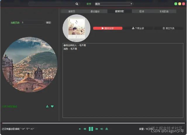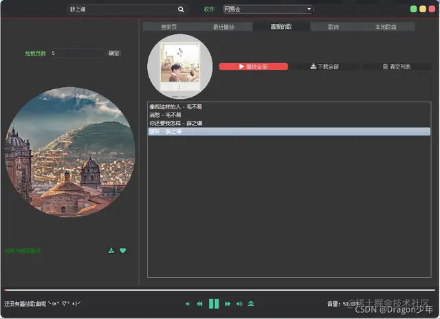 在之前的V1.0版本中,我们已经完成了播放器UI界面的设计,对播放器的画面布局进行排版设计;其次音乐播放器的最重要的核心功能根据关键字搜索自动爬取音乐并且进行音乐播放已经完成了。当然也完成了一些播放器常见的附加功能,如播放方式列表循环、单曲循环、随机播放;当前上一首下一首播放;播放暂停开始;音量增加减少等。