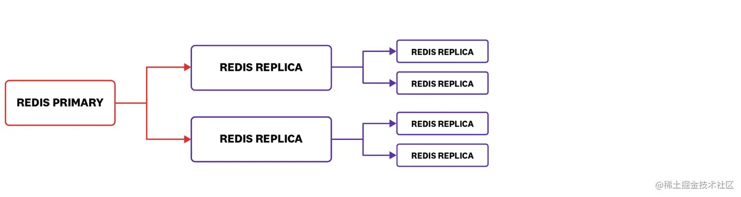 注意:在上图中,Redis主数据库将显示其具有两个连接的副本,并且第一个子节点将各自报告它们也具有两个连接的副本。 由于辅助副本未直接连接到Redis主副本,因此它们不包括在连接到主副本的副本计数中。