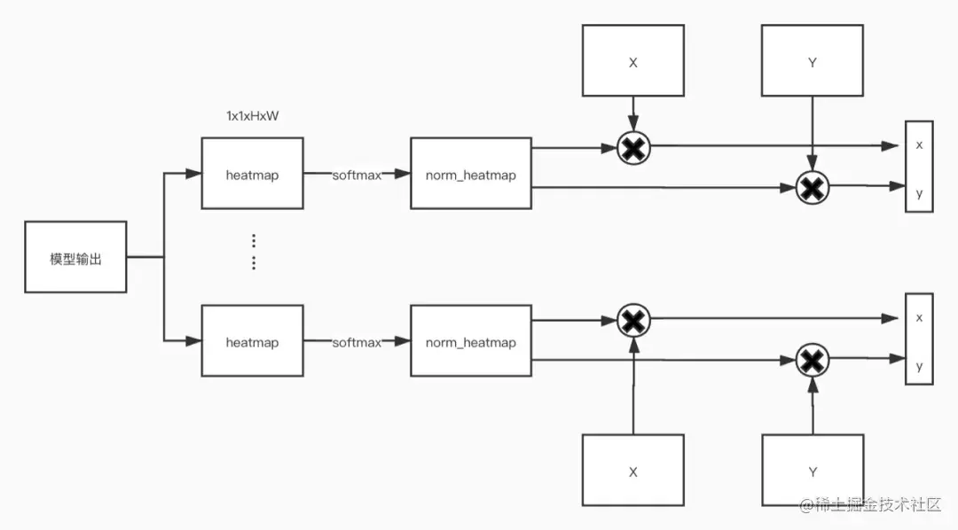 借鉴了目标检测中anchor的方式,假设需要预测的关键点,则将其转换成如下。其中C表示关键点的位置范围,X和Y表示需要预测的offset。最终解码就是在热力图C上取到argmax,然后对X与Y的热力图上拿到对应位置的offset,最后进行相加得到数值坐标。