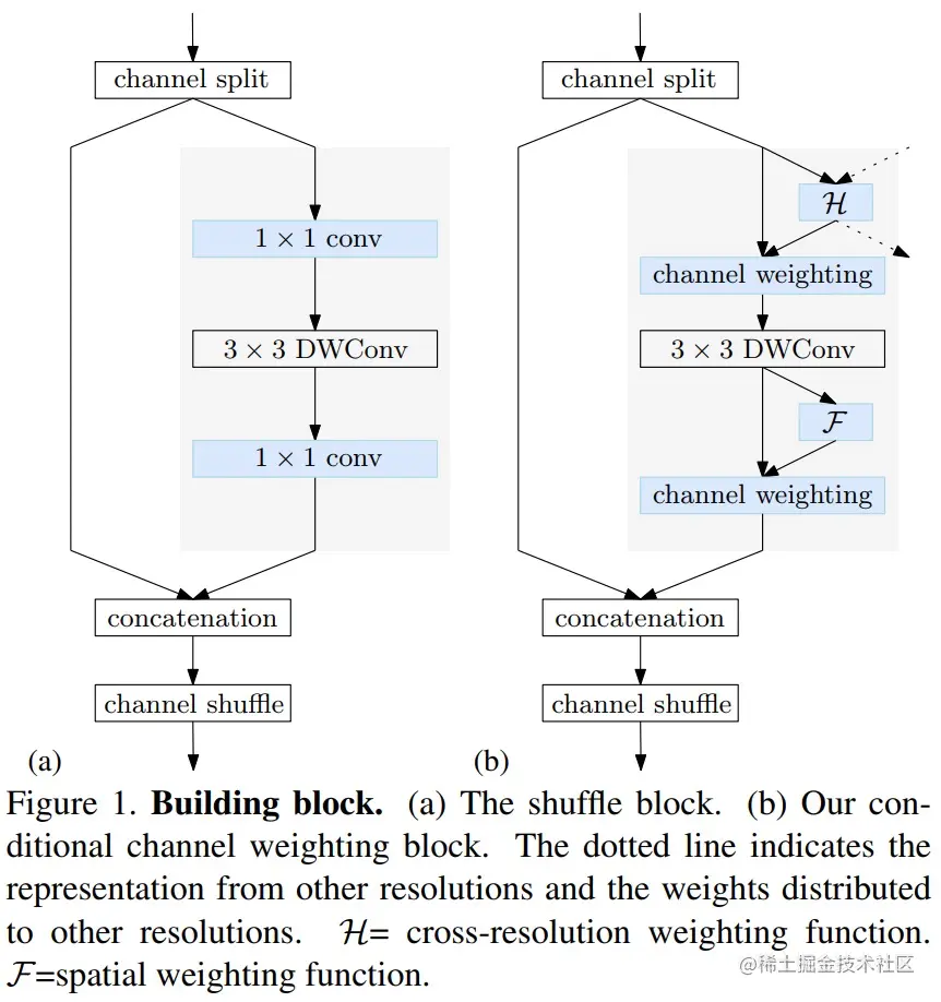 在前面提及到的contional channel weight如下所示。左边是ShuffleNet中的shuffle block,右图是contional channel weight。可以看到,采用新模块来取代了1*1的卷积,实现跨stage信息交流与局部信息交流。其具体做法包含了Cross-resolution weight computation和Spatial weight computation。这两个模块的本质是注意力机制。