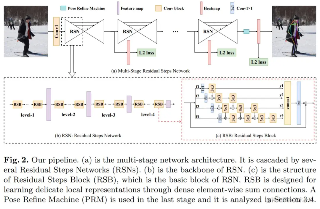 本文是2019年coco关键点检测冠军的方案。其本文的主要思想是,最大程度聚合具有相同空间尺寸的特征,以此来获得丰富的局部信息,局部信息有利于产生更加准确的位置。因此提出了RSN网络,如下图一所示。从图来看,即融合不同感受野特征。RSN的输出包含了low-level准确的空间信息与high-level语义信息,空间信息有助于定位,语义信息有助于分类。但是这两类信息给最终预测带来的影响权重是不一致的,需要使用到PRM模块来平衡,RPM模块本质就是一个通道注意力和空间注意力模块。