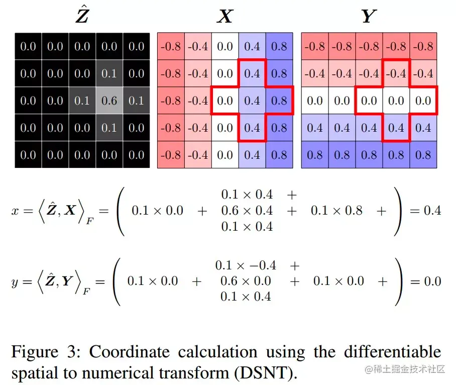 - 将X 和 Y 矩阵分别与 norm_heatmap 点乘,从而得到最终的数值坐标。这么做的原因是, norm_heatmap 表示概率密度函数, X 矩阵表示索引,两者点成表示预测x的均值。通过均值来表示最终的预测的坐标,这样的好处是,a)可微分;b)理论误差下限小。
