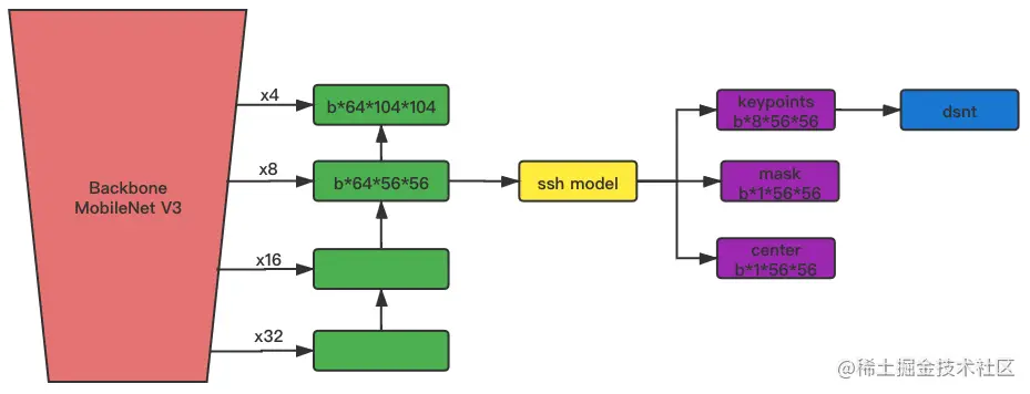 本次模型借鉴了CenterNet/RetiaFace/DBFace中的相关工作。本次的使用了dsnt的方案。主要原因是:需要运行在端上,实时性是首要考虑因素。dsnt在低分辨率的优势明显。