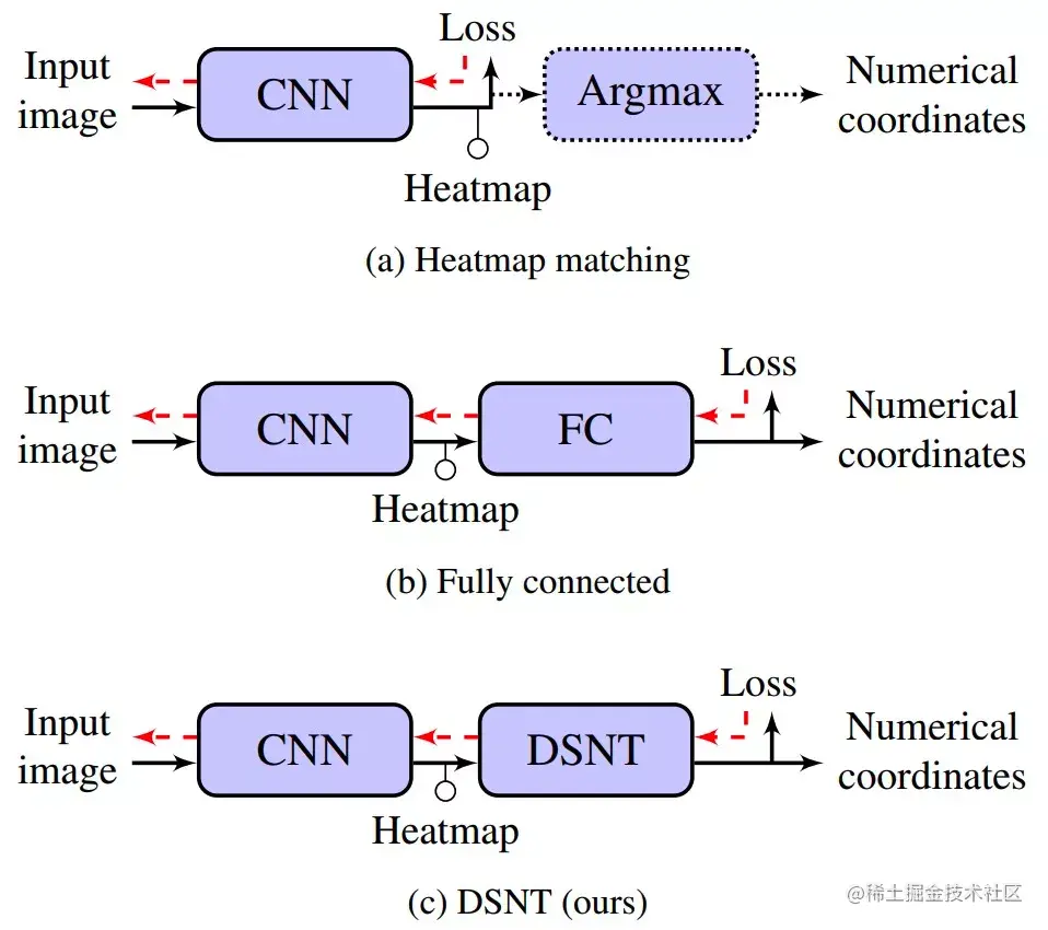 - 通过对heatmap中取argmax,得到相应最大的点,以此来转换成数值坐标。此种方式具有较好的空间泛化性,但是由于在训练中argmax是不可导的,通常使用heatmap来逼近编码的高斯热例图,这会导致损失函数与最终评价指标的不一致。其次,在推理阶段,只使用到最大响应的坐标点来计算数值坐标,而在训练阶段,所有坐标点都对损失有贡献。第三,通过heatmap转换成数值坐标,是会存在理论误差下限的;