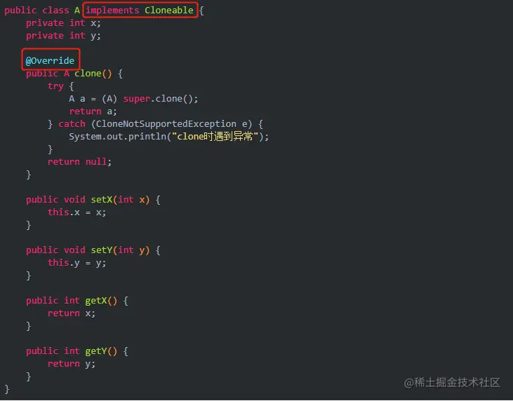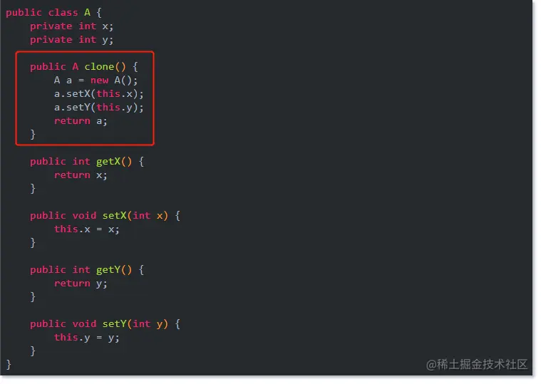 套用到上面例子的 A 类中,需要在 A 类里面提供一个 clone() 方法,在方法中创建一个当前对象并返回