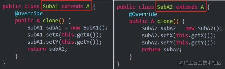 假如 A 有两个子类,分别是 SubA1 和 SubA2。两个子类分别继承 A 抽象类,并实现 clone()抽象方法