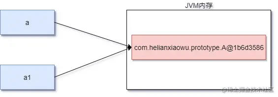 在加载a1 的时候,因为 a1 是将 a 的值赋值给了 a1 ,所以在给 a1 分配空间时,只是把 a1 的引用指向了 a 所在的内存地址,并没有给 a1 分配独立的内存空间