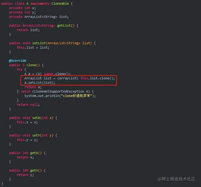 在本例子中,引用类型所属的类是 ArrayList,它本身已经实现了 Cloneable 接口,并重写了 Object 类的 clone() 方法。