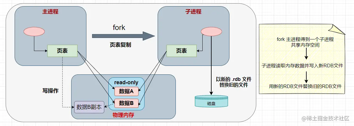 bgsave 开始的时候会 fork 主进程得到一个新的子进程,而 子进程 是 共享 主进程的内存数据的。子进程会将数据写到磁盘上的一个临时的 .rdb 文件中,当子进程写完临时文件后,会将原来的 .rdb文件替换掉。这个就是 fork 的核心,那什么是 cow 呢? cow 全称 copy-on-write 技术,当主进程执行读操作的时候是访问共享内存的,而主进程执行写操作的时候,则会拷贝一份数据,执行写操作。