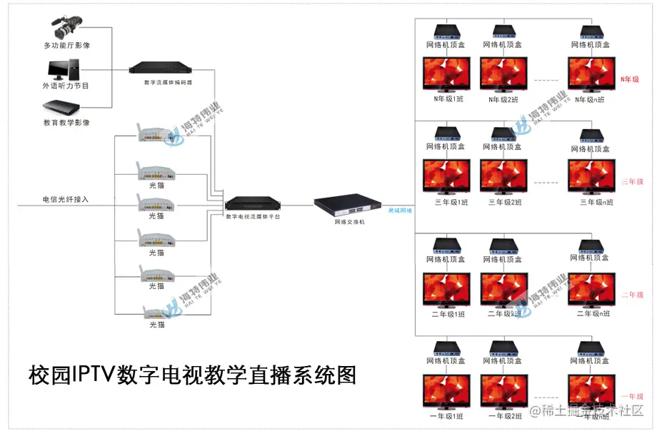 校园IPTV数字电视教学直播系统由节目源、传输部分、接收设备构成。
