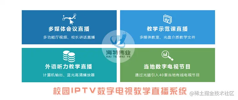 海特伟业校园IPTV数字电视教学直播系统以校园局域网为传输媒介,通过TCP/IP协议传输MPEGII格式视频、MP3音频电视的教学直播节目,视频可达到4K高清画质,完全实现了电视教学直播节目无网纹、无噪点、无噪声叠加。该系统已于9月上旬建成并正式投入使用,可以实现学校60个班(以后可扩展至120个班接)高清收看多功能厅会议直播、多媒体教室示范课、外语听力教学、当地有线电视等教育教学节目。系统预留教学节目IP互动点播接口。