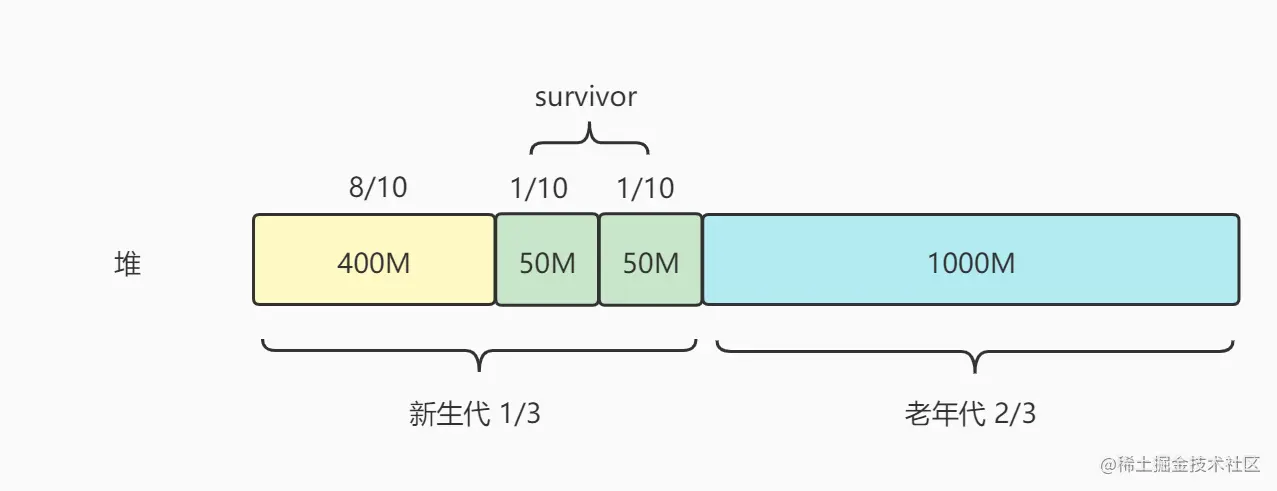 假设我们只有一台2核4G的服务器,分配给堆的内存一般就1.5G左右,通过计算,可以算出堆中每个区域的大小,如下图: