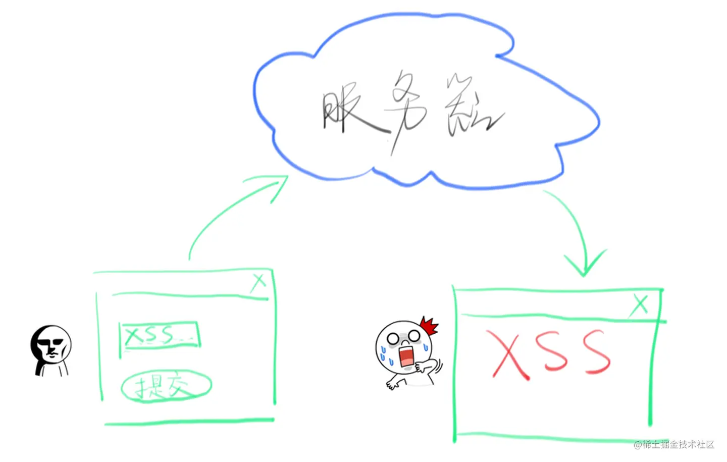 用户 A 提交评论「小谷你好」到服务器,然后用户 B 来访问网站,看到了 A 的评论「小谷你好」,这里没有 XSS。