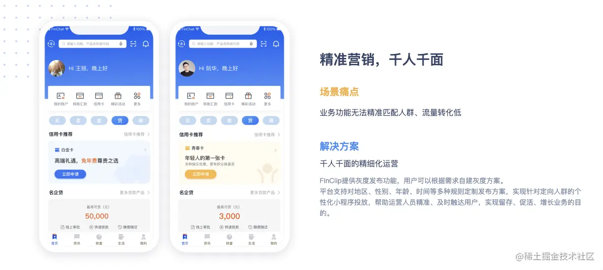 因为在 FinClip 上可以随意实现任何粒度的数字化场景,通过算法去基于用户个性化特点进行各种“乐高”的组装,实现千人千面、智能推荐, 不再是空话一句。在 FinClip 上的任何小程序,可以根据用户画像、客群分层,动态控制可见范围,例如一个仅针对某某地区的金牌会员可见的运营活动小程序,通过简单配置进行发布即可,无需编写任何复杂的应用逻辑代码。