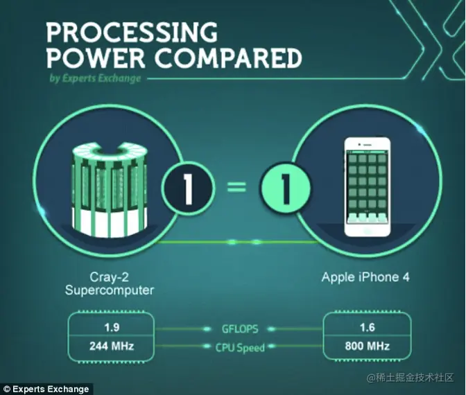也就是说,现在我们每个人口袋里,都放着一台等价于 35 年前全球顶级超算能力的计算机,它比 50 年前让火箭成功着陆在月球上的计算机强百万倍!