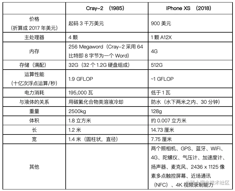 我们拿 1985 年可能是全球最快的超级计算机 Cray-2 和 2018 年的 iPhone XS 比较一下,看看这三十年来,普通人(普通到一辈子没用过个人电脑的大妈大爷们)手中的“算力”是从“一穷二白”变成一个什么样的恐怖数字: