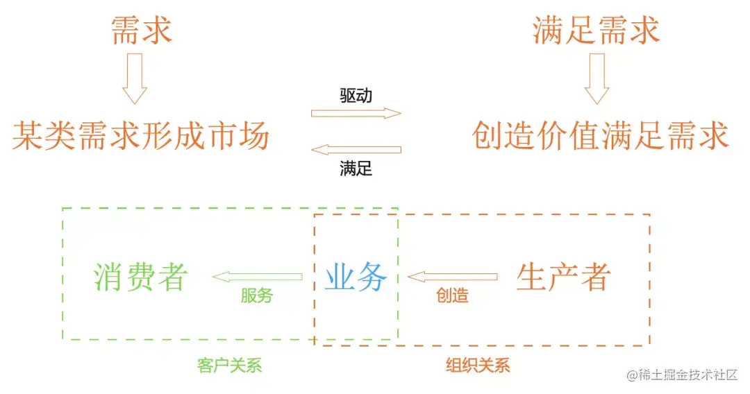 **首先,业务是服务提供方满足需求方诉求的主要形式。**从人的物质方面的本质出发来看,我们很容易看到这样的演变过程:在一方面,人的某一类需求,在共性足够大的情况下,会形成市场,诞生了需求方;同时在另外一方面,人通过创造价值(劳动)满足别人的需求,诞生了服务提供方。如果以服务提供方作为叙事主体,从其视角来看,“服务提供方满足需求方”的整个过程就可以抽象地总结为“服务提供方在做某个业务”。当然,这里我们没有展开详细描述服务提供者满足需求方的过程是如何由最开始的简单的物-物交换的形式,逐步演变到现在“通过有组织地生产价值,有组织地保障价值交付过程、大量地使用更先进的技术提升生成经营效率”等等这样复杂的形式。简而言之,我们没有展开谈业务的发展过程,但这不影响我们的结论——服务提供方是以“业务”的形式满足需求方的需求的,或者说,企业是以业务的形式服务于市场的。