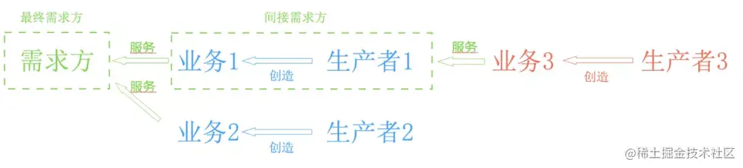 讨论广义的业务的参与方,由于抽象程度过高,所以可讨论的内容不多。不过这恰好能够让我们看到业务的最底层的逻辑和核心原则是什么,并且这个原则是所有在其之上演化出的业务的基础原则,虽然日常工作中可能感知不到它的存在,但它最终在长期的事物演进过程中冥冥之中发挥着最根本性的作用。所以这部分看似简单,却是最容易被忽略的,也是最不应该被忽略的。