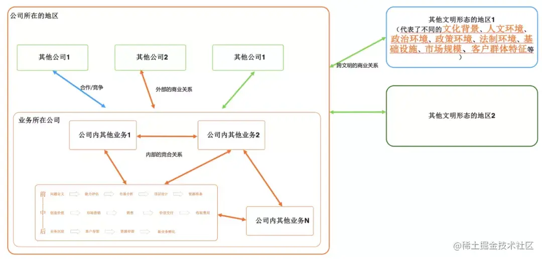 从业务与外界的关系及相互影响的视角来看,业务一般在企业内有上下游的其他业务与之配合形成更大的业务,在内部构成相互合理的关系;也可能在企业中存在其他解决相同问题的类似的业务,构成内部的竞争关系;当然在公司外部,也面临着竞对企业的同样的业务,构成外部的直接的竞争关系;也存在着外部的企业业务与当前业务形成合作关系,通过价值传递构成价值链或产业链,共同服务于某个客户或某类客户形成的市场。同时业务会受到不同的地区的文化背景、人文环境、政治环境、政策环境、法制环境、基础设施、市场规模、客户群体特征等因素的影响,这里我们就不再展开详细说明了,具体如下图所示: