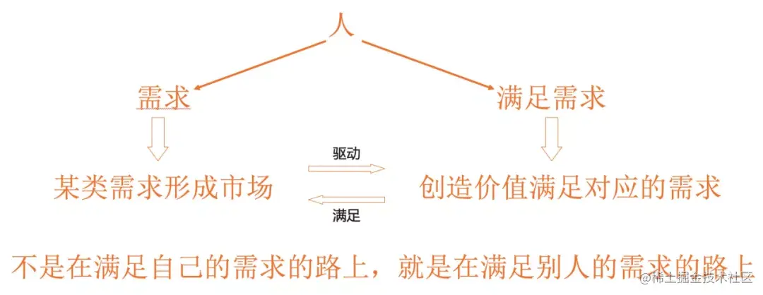 从上面的总结可以看出来,从人的物质性角度来看,一切人类所有的事情都可以抽象为两件事:“需求”和“满足需求”,也就是说,我们每个人,不是在满足自己的需求的路上,就是在满足别人的需求的路上,我们每个人做的每一件大事小事,不是在满足自己的需求,就是在满足别人的需求,如下图所示: