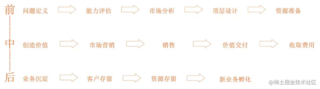 从业务的生命周期视角上来看,业务在开展前、开展中、开展后也有大量的事情要做,如下图所示: