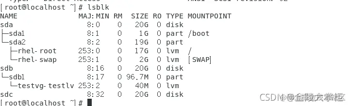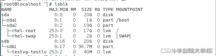 3、使用lsblk命令查看系统中已经识别的硬盘,不出所料还是两块硬盘;