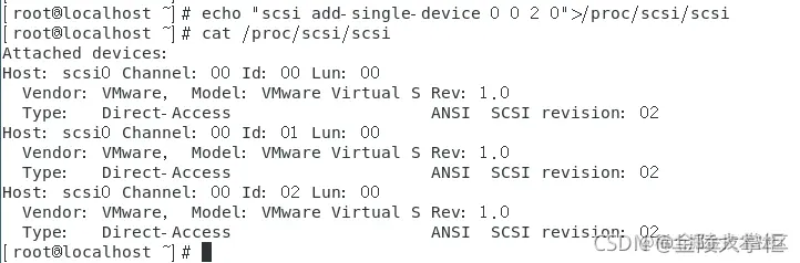6、执行语句:echo "scsi add-single-device w x y z ">/proc/scis/scsi,并查看/proc/scsi/scsi 文件的变化;